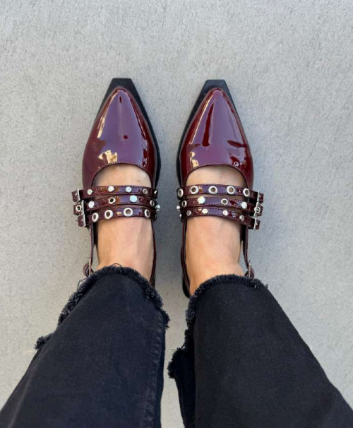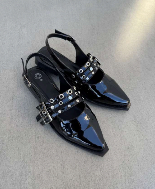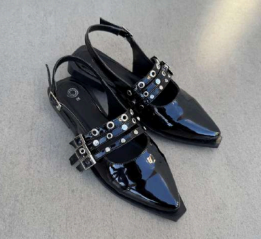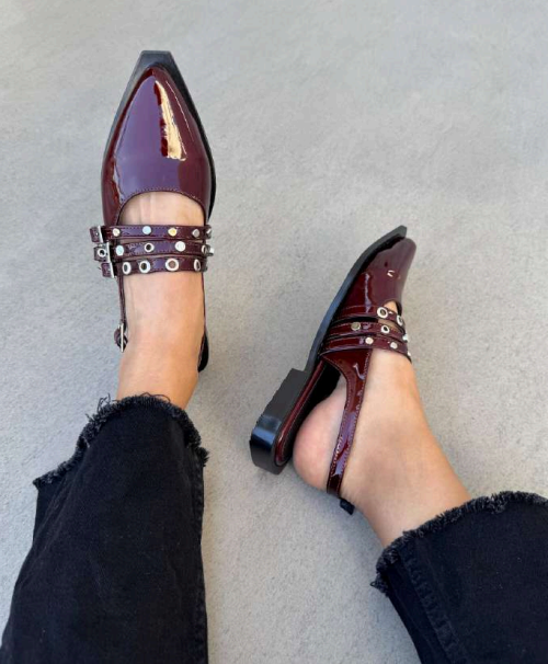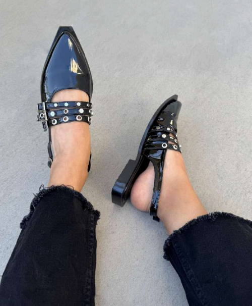 Lleva tu calzado a otro nivel con estos Mary Janes de diseño vanguardista. Perfectos para quienes buscan un zapato cerrado que no sea aburrido, este modelo destaca por su silueta de punta puntal que estiliza la pierna y su llamativo sistema de tres correas con ojales metálicos.