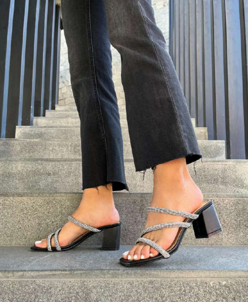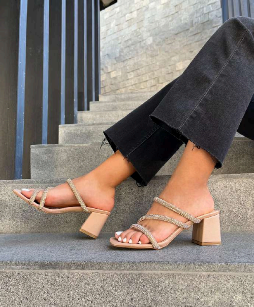 Lo que hace especial a este modelo es el detalle de sus tiras con aplicaciones de brillo, que capturan la luz de manera sofisticada, convirtiendo un calzado sencillo en una pieza de diseño exclusiva.