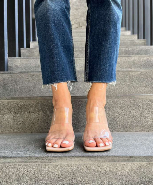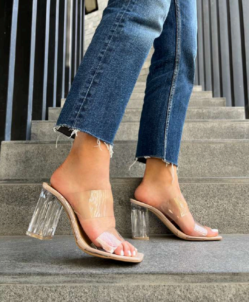 El tacón de 9 cm tiene un diseño geométrico transparente que aporta estabilidad y un toque de lujo arquitectónico a cada paso.